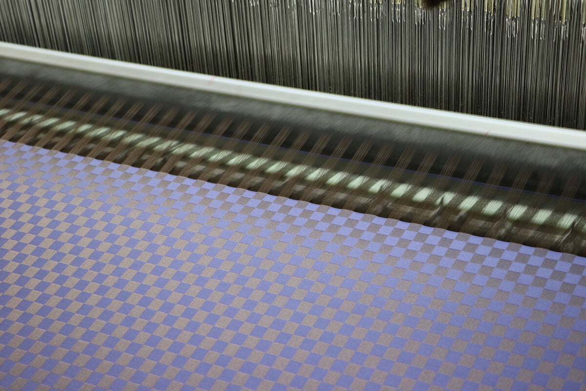 Warping is the process of arranging yarn-dyed threads according to predetermined numbers, densities, and lengths and winding them on a beam. When replacing a beam with a new one on the loom, the old and new warp threads must be tied together. A skilled craftsperson is in charge of this delicate process of connecting each individual thread with the same tension. The finished beam is then sent to the next factory.
